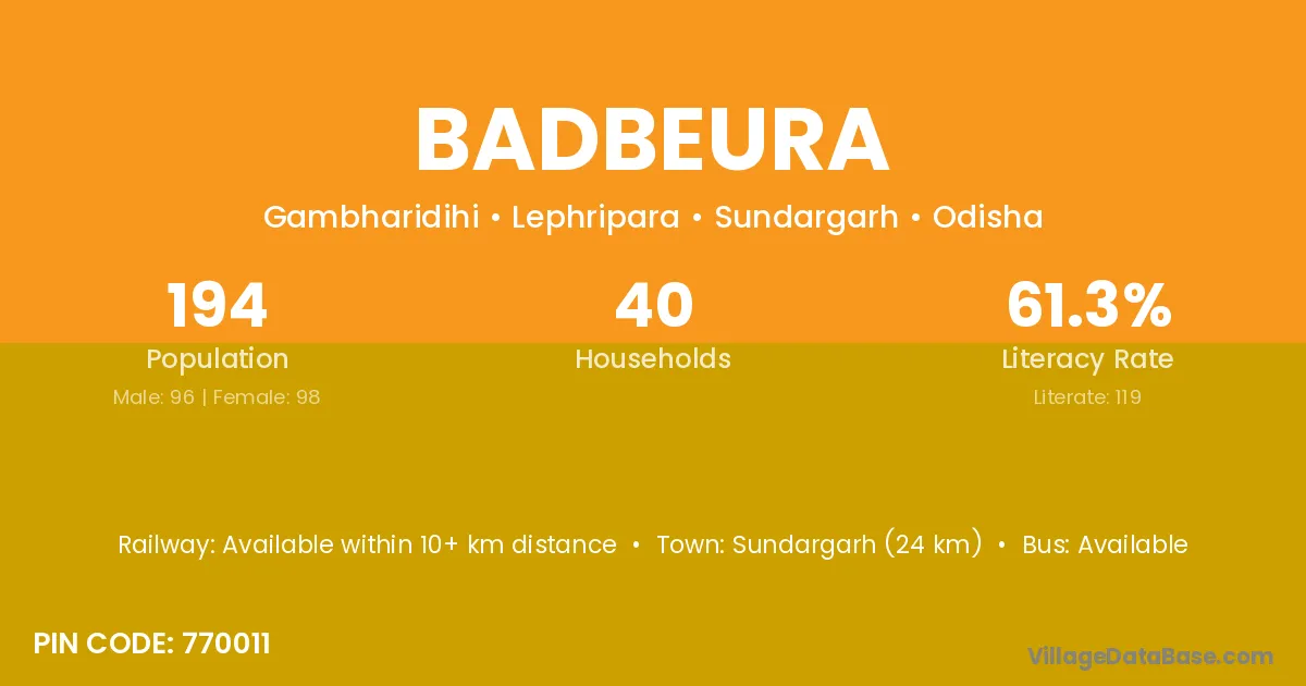Sundargarh (24 km) is the nearest town to Badbeura village for major economic activities and is located approximately 24 km away.