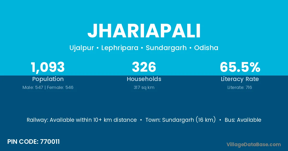 Sundargarh (16 km) is the nearest town to Jhariapali village for major economic activities and is located approximately 16 km away.