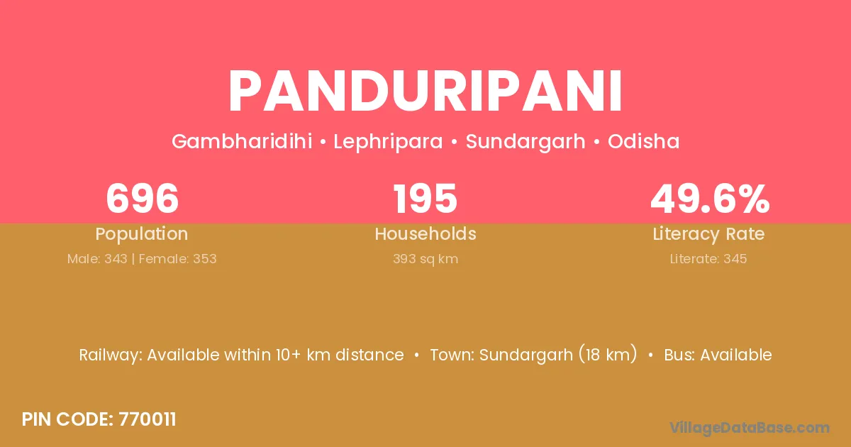 Sundargarh (18 km) is the nearest town to Panduripani village for major economic activities and is located approximately 18 km away.