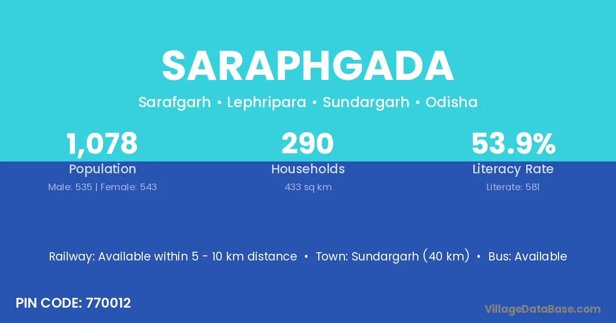 Sundargarh (40 km) is the nearest town to Saraphgada village for major economic activities and is located approximately 40 km away.