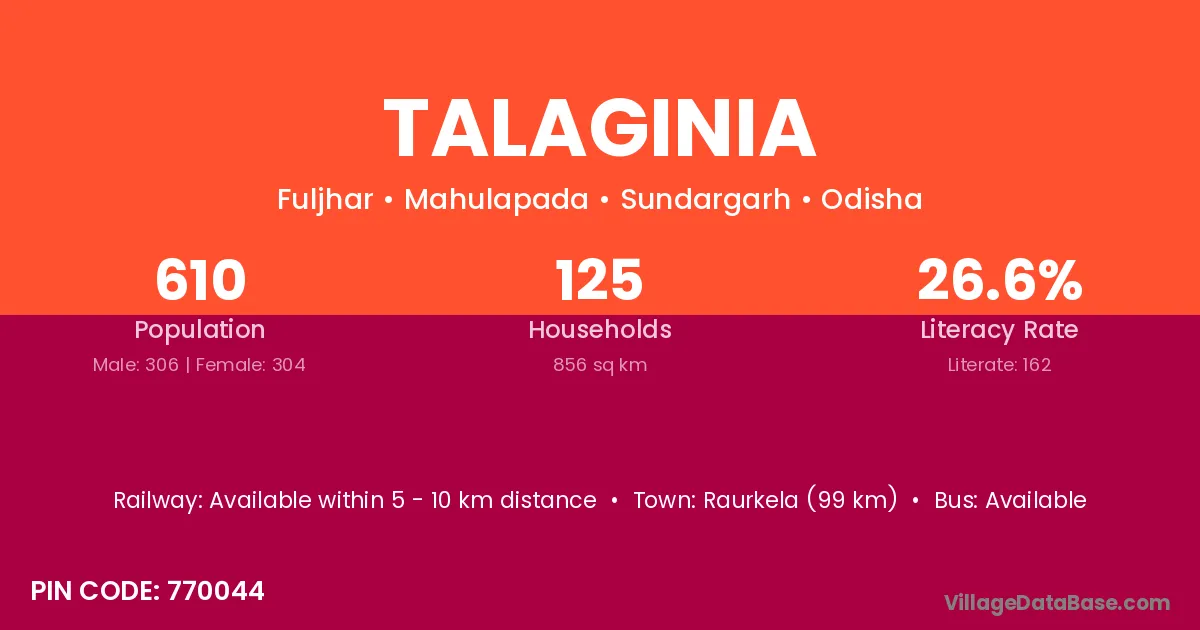 Talaginia village has a total population of 610 people, of which 306 are males and 304 are females.