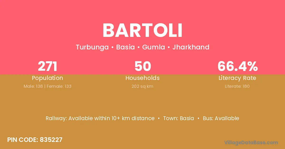 The literacy rate of Bartoli village is 51.30%. Male literacy stands at 56.38% and female literacy at 46.02%.