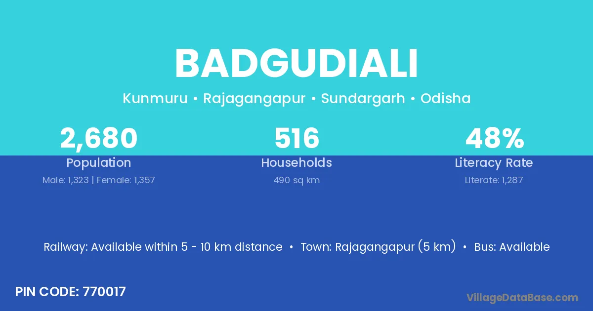 Rajagangapur (5 km) is the nearest town to Badgudiali village for major economic activities and is located approximately 5 km away.