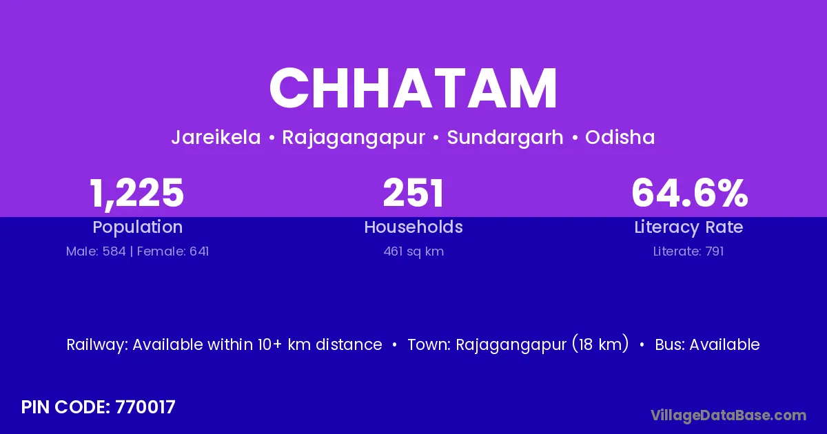 Rajagangapur (18 km) is the nearest town to Chhatam village for major economic activities and is located approximately 18 km away.