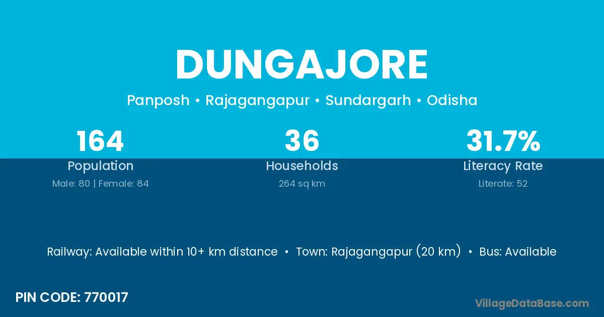 Rajagangapur (20 km) is the nearest town to Dungajore village for major economic activities and is located approximately 20 km away.