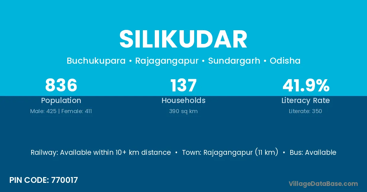 Rajagangapur (11 km) is the nearest town to Silikudar village for major economic activities and is located approximately 11 km away.