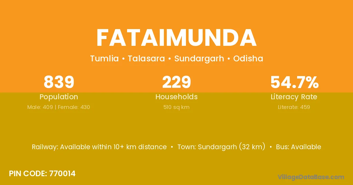 Sundargarh (32 km) is the nearest town to Fataimunda village for major economic activities and is located approximately 32 km away.