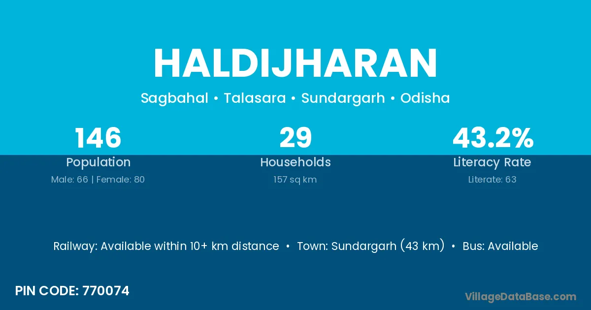 Sundargarh (43 km) is the nearest town to Haldijharan village for major economic activities and is located approximately 43 km away.