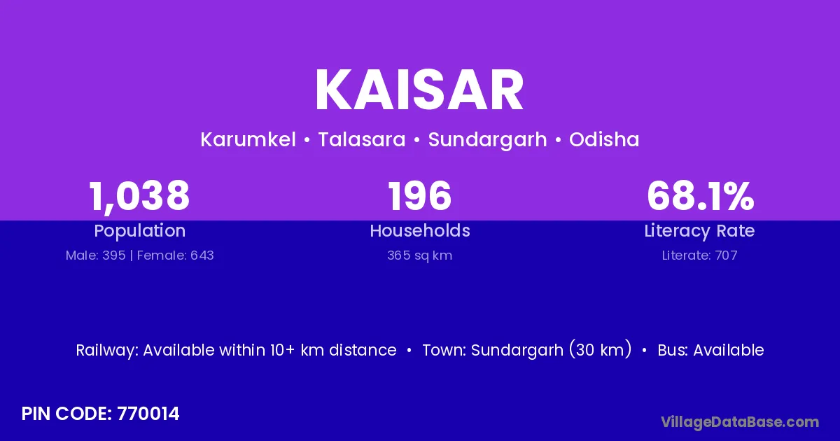 Sundargarh (30 km) is the nearest town to Kaisar village for major economic activities and is located approximately 30 km away.
