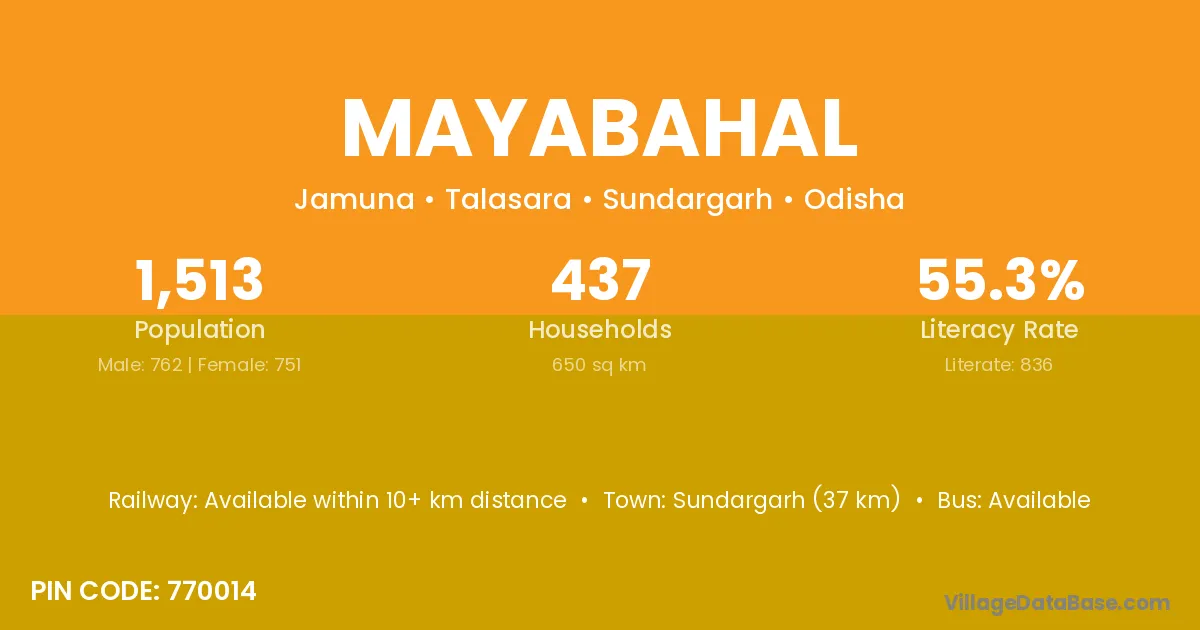 Sundargarh (37 km) is the nearest town to Mayabahal village for major economic activities and is located approximately 37 km away.