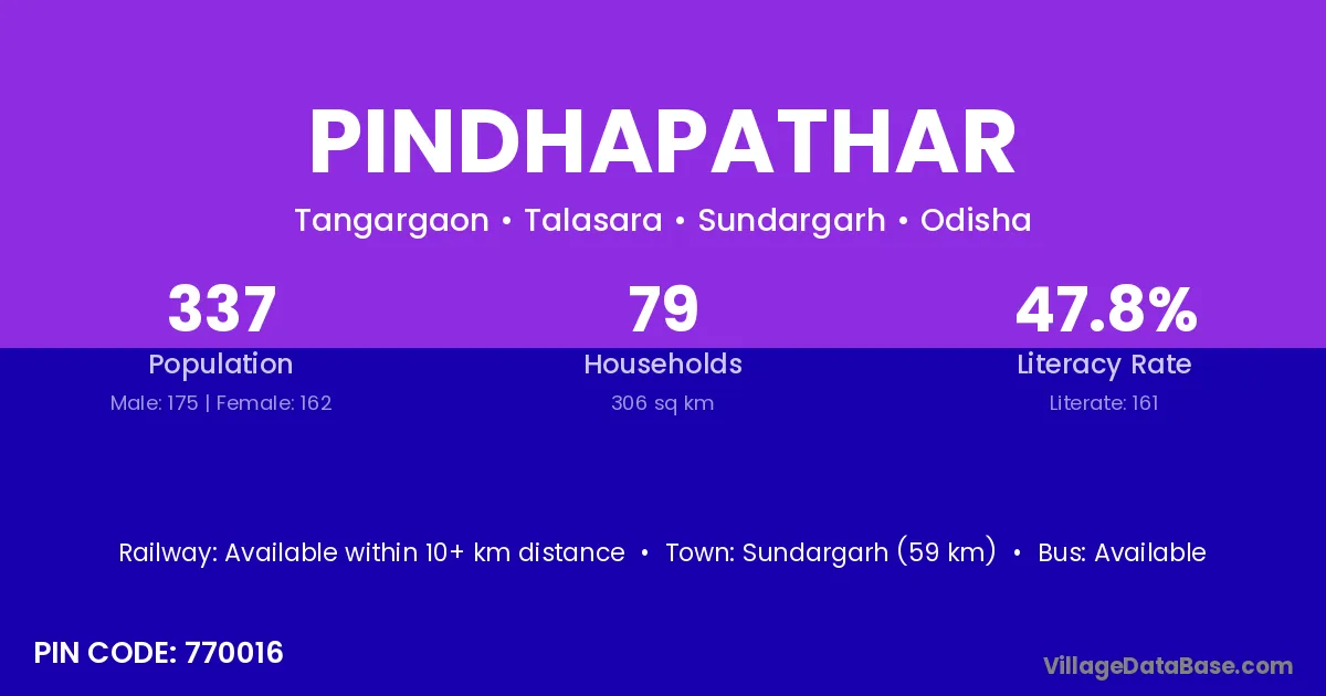 Sundargarh (59 km) is the nearest town to Pindhapathar village for major economic activities and is located approximately 59 km away.