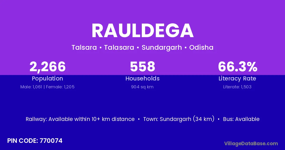 Sundargarh (34 km) is the nearest town to Rauldega village for major economic activities and is located approximately 34 km away.