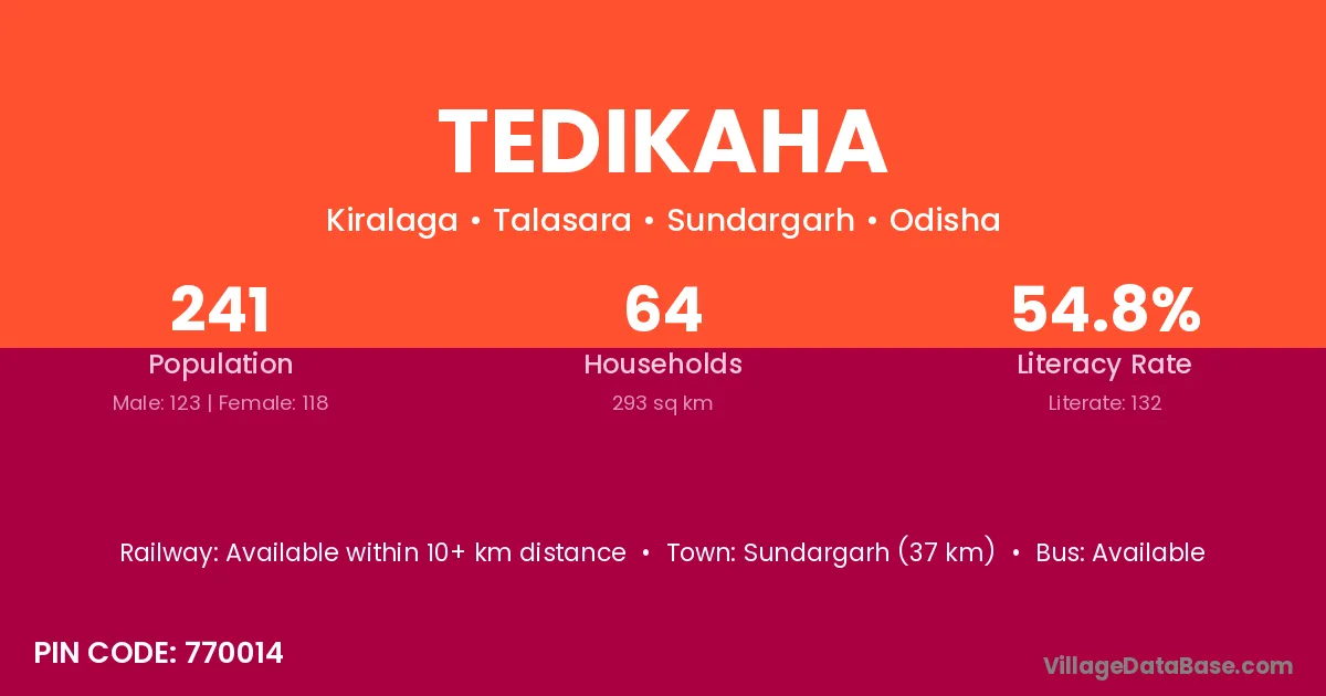 Sundargarh (37 km) is the nearest town to Tedikaha village for major economic activities and is located approximately 37 km away.