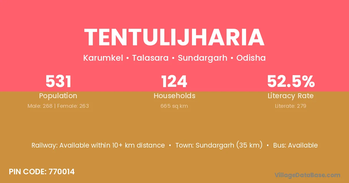 Tentulijharia village has a total population of 531 people, of which 268 are males and 263 are females.
