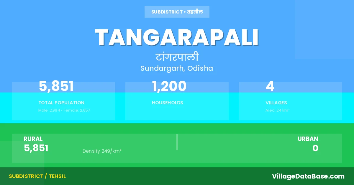 According to the 2011 census The total area of Tangarapali Tehsil is 24 km², with a population of 5851 people. The population density is 249 inhabitants per square kilometre, and there are approximately 1200 houses in the sub district.