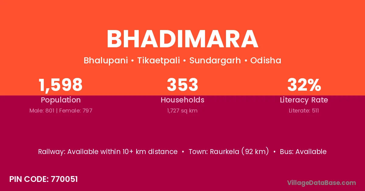 Raurkela (92 km) is the nearest town to Bhadimara village for major economic activities and is located approximately 92 km away.