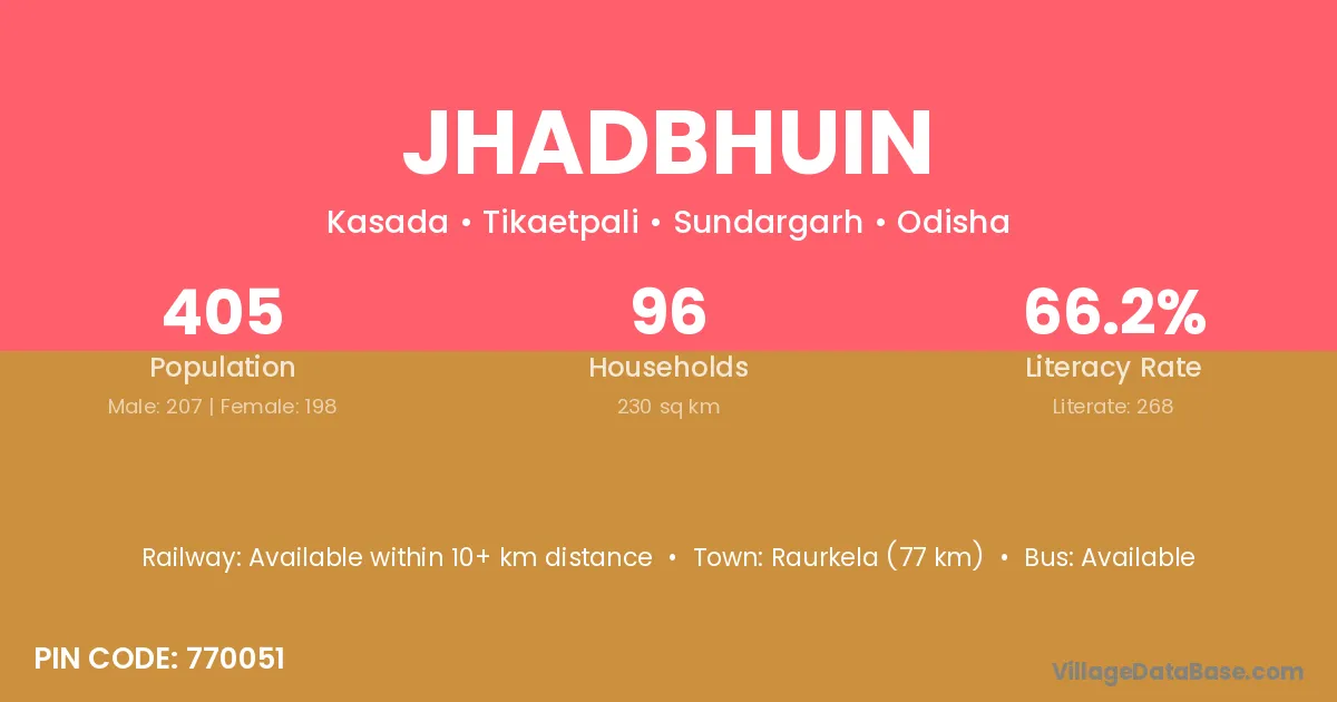Raurkela (77 km) is the nearest town to Jhadbhuin village for major economic activities and is located approximately 77 km away.