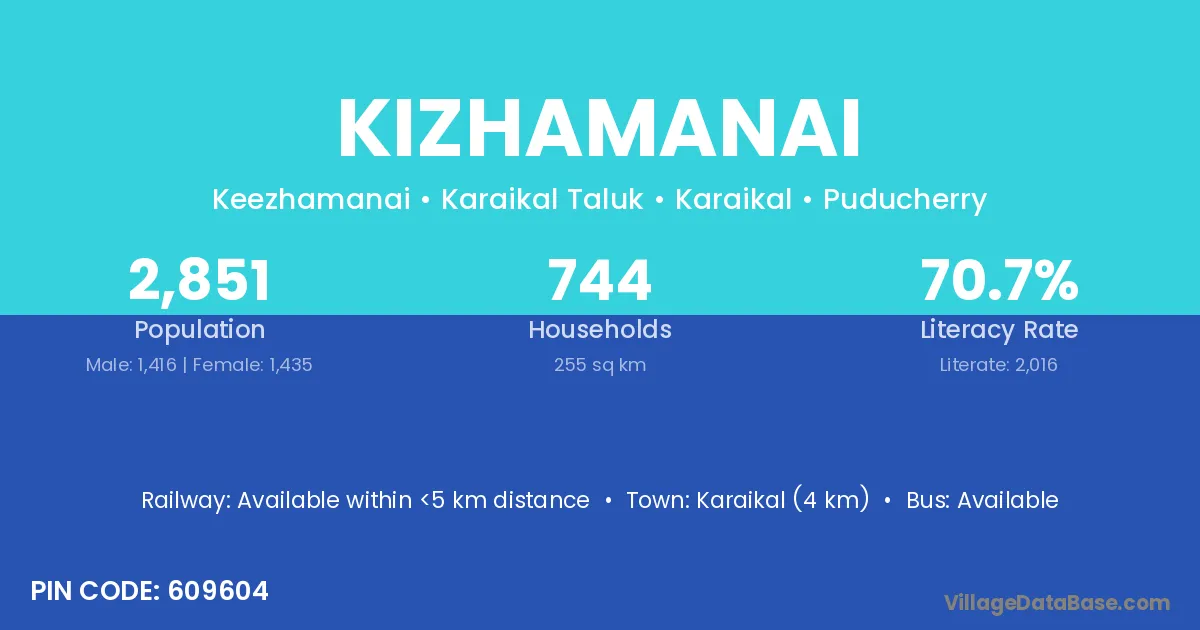 Karaikal (4 km) is the nearest town to Kizhamanai village for major economic activities and is located approximately 4 km away.