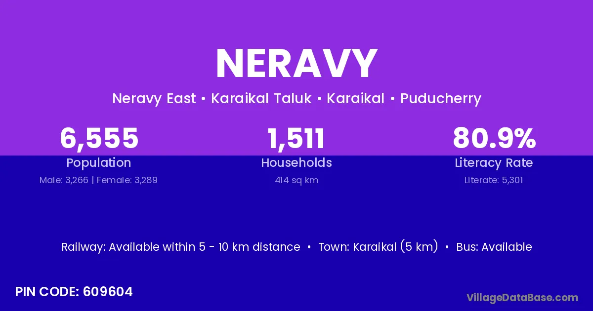 Karaikal (5 km) is the nearest town to Neravy village for major economic activities and is located approximately 5 km away.