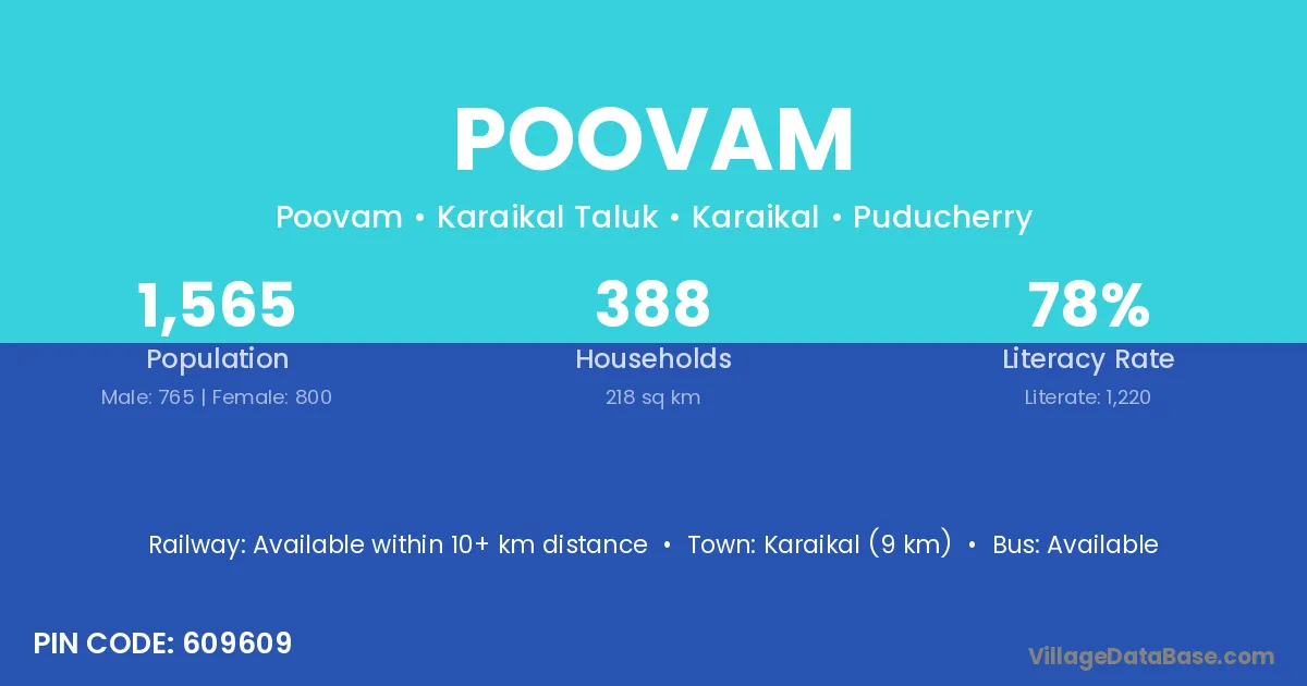 Karaikal (9 km) is the nearest town to Poovam village for major economic activities and is located approximately 9 km away.