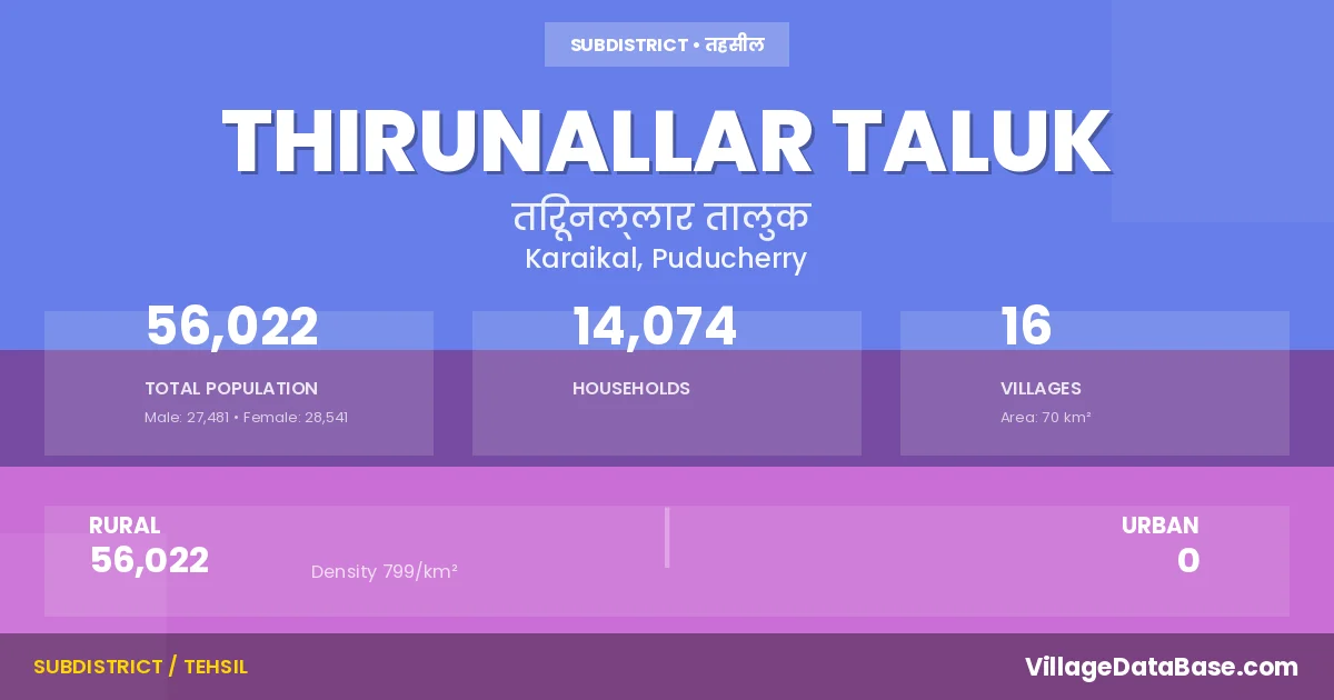 According to the 2011 census The total area of Thirunallar Taluk Taluka is 70 km², with a population of 56022 people. The population density is 799 inhabitants per square kilometre, and there are approximately 14074 houses in the sub district.