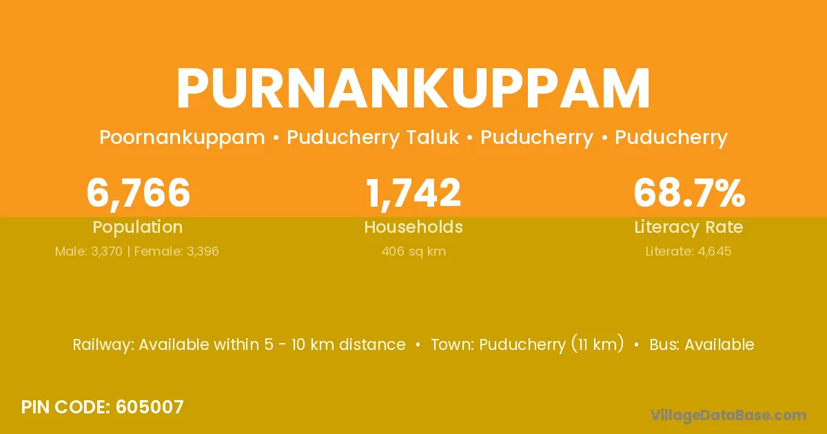 Purnankuppam village has a total population of 6,766 people, of which 3,370 are males and 3,396 are females.