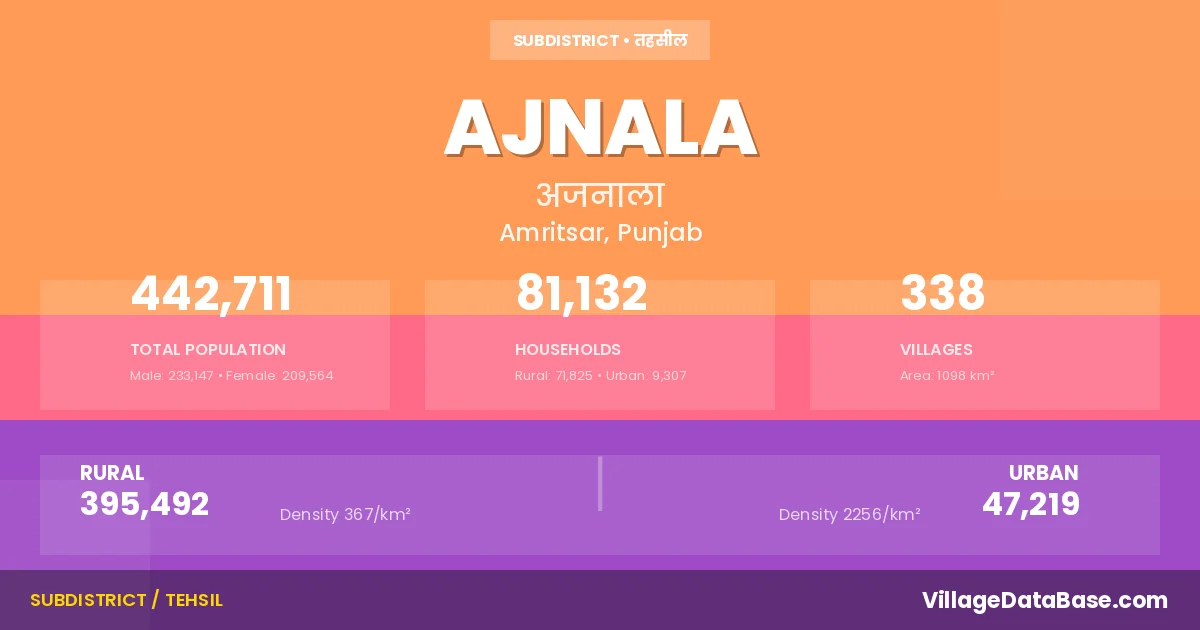 According to the 2011 census The total area of Ajnala Tehsil is 1098 km², with a population of 442711 people. The population density is 403 inhabitants per square kilometre, and there are approximately 81132 houses in the sub district.