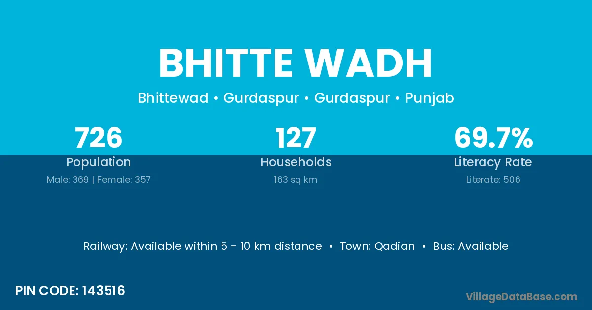 The literacy rate of Bhitte Wadh village is 52.38%. Male literacy stands at 52.72% and female literacy at 51.98%.