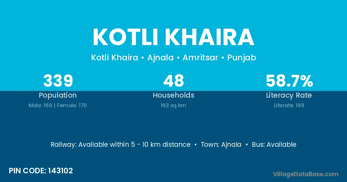 Kotli Khaira village has a total population of 339 people, of which 169 are males and 170 are females.