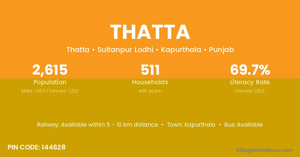 The literacy rate of Thatta village is 47.19%. Male literacy stands at 48.09% and female literacy at 46.22%.