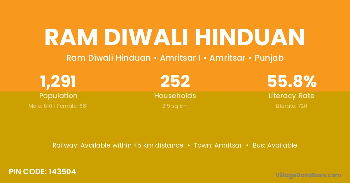 Ram Diwali Hinduan village has a total population of 1,291 people, of which 610 are males and 681 are females.