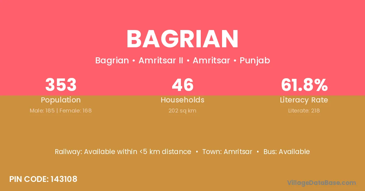 According to Census 2011 information, the village code of Bagrian village is 143108.