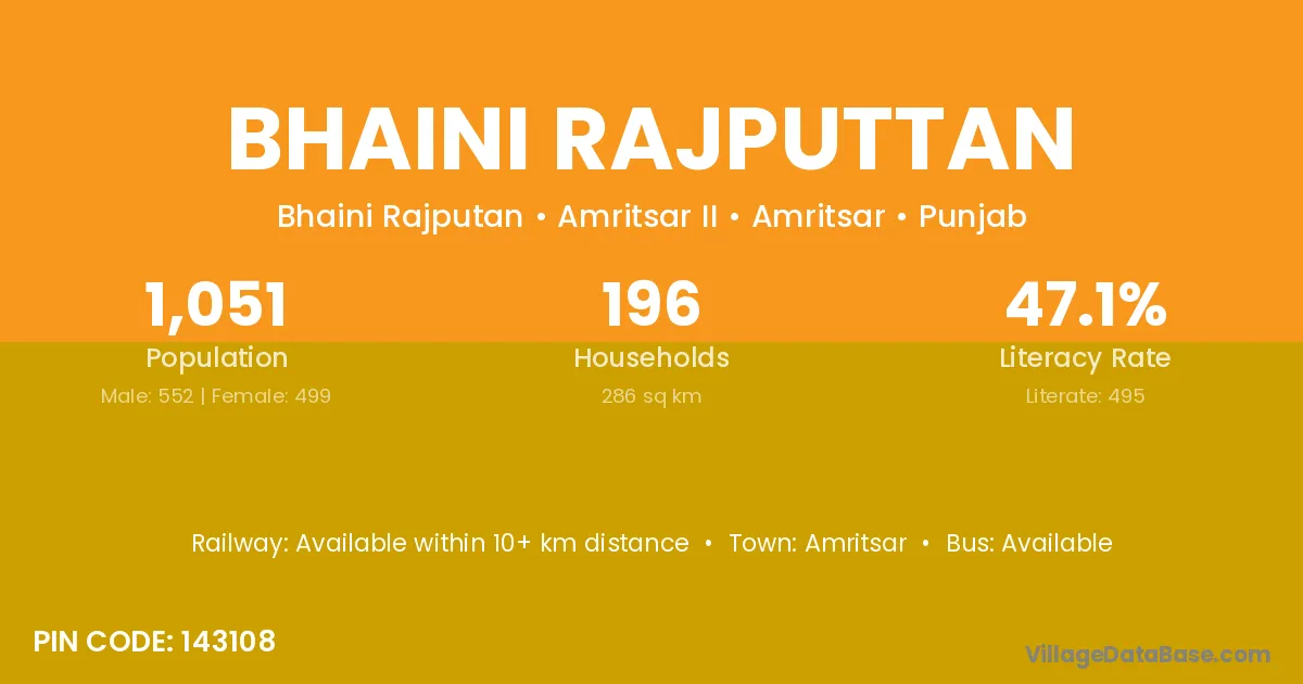 According to Census 2011 information, the village code of Bhaini Rajputtan village is 143108.