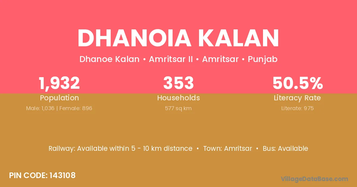 According to Census 2011 information, the village code of Dhanoia Kalan village is 143108.