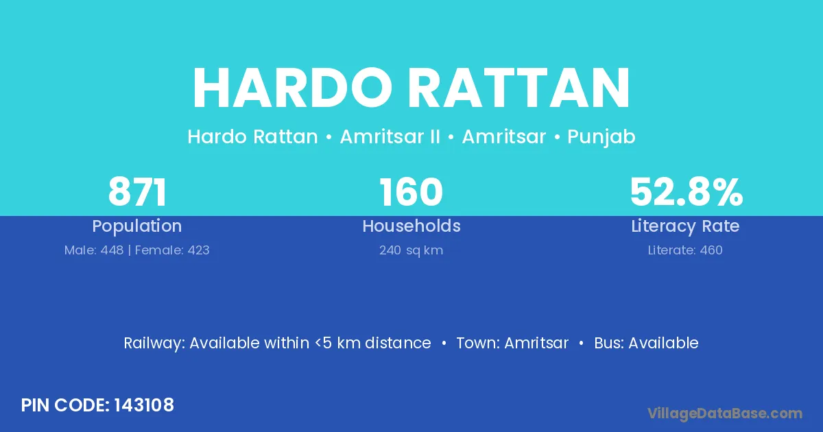 Hardo Rattan village has a total population of 871 people, of which 448 are males and 423 are females.