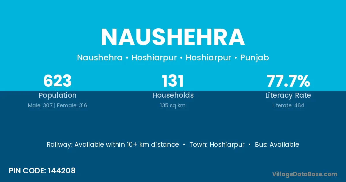Naushehra village has a total population of 3,993 people, of which 2,140 are males and 1,853 are females.