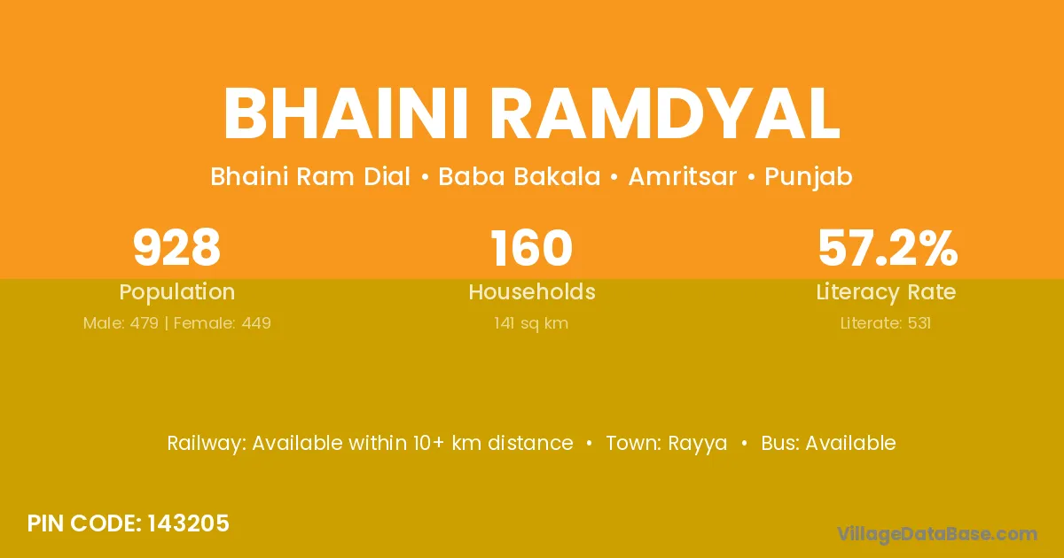 Bhaini Ramdyal village has a total population of 928 people, of which 479 are males and 449 are females.