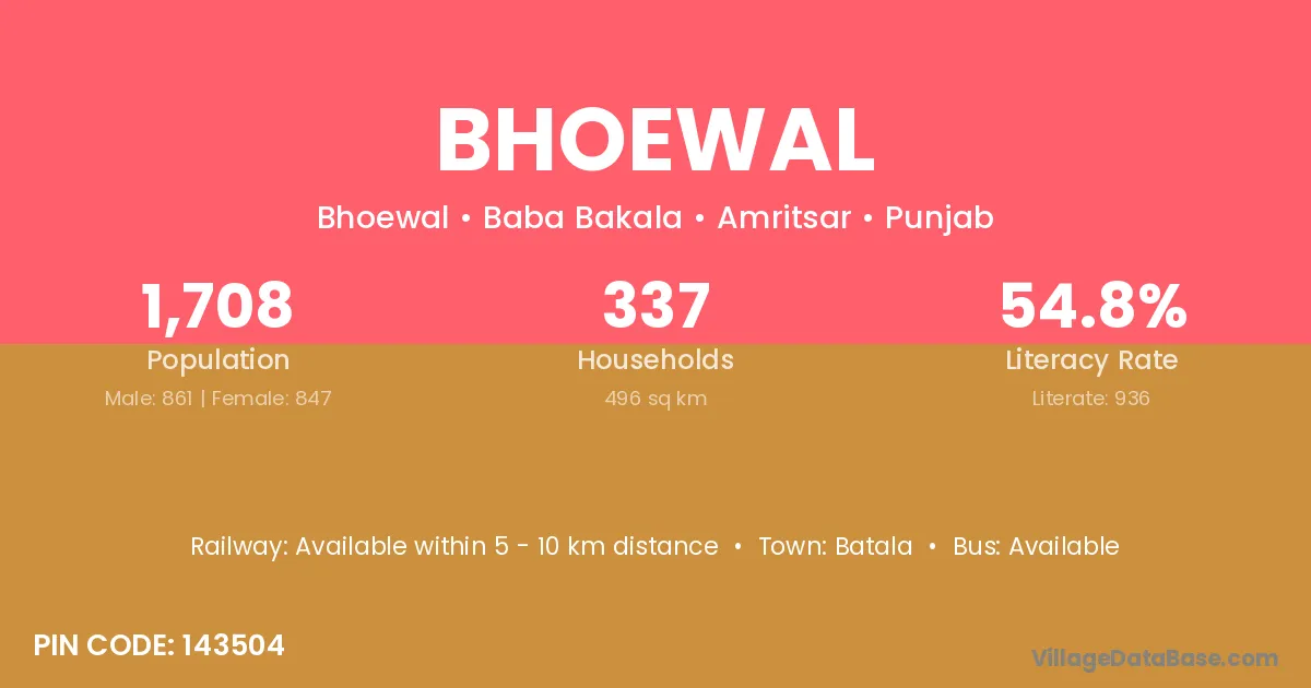 Bhoewal village has a total population of 1,708 people, of which 861 are males and 847 are females.