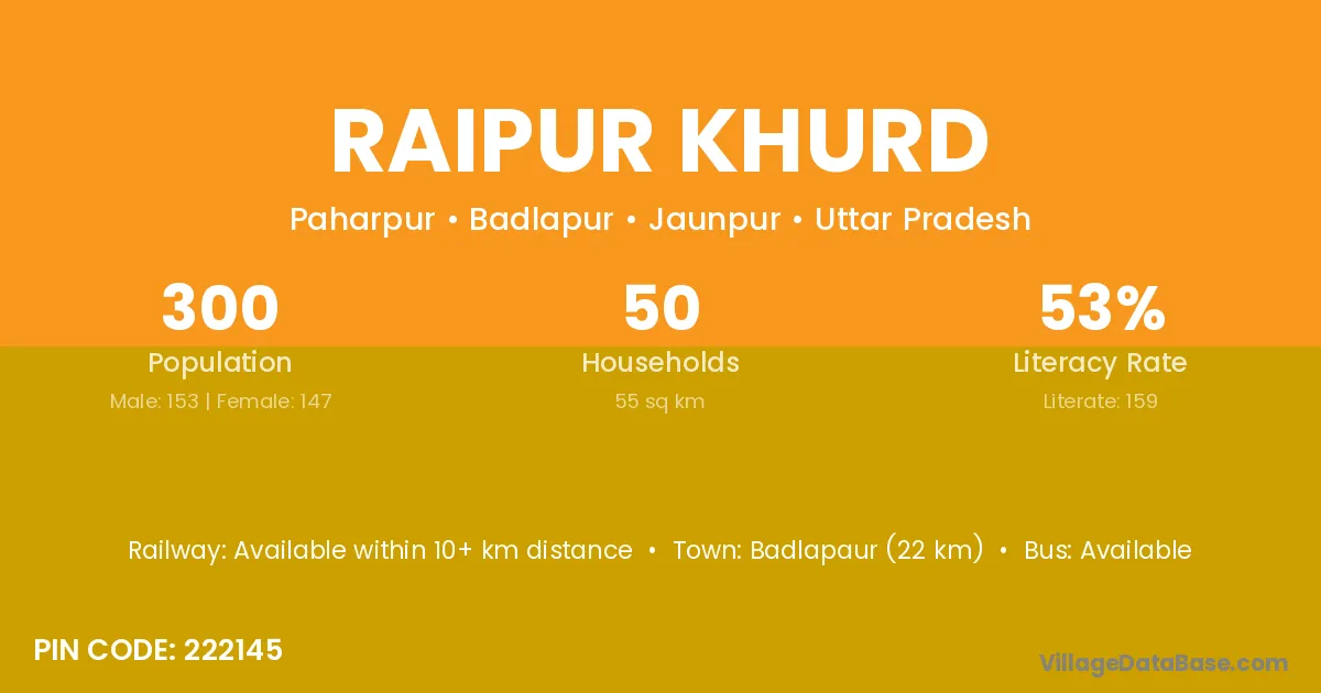 The literacy rate of Raipur Khurd village is 69.90%. Male literacy stands at 74.38% and female literacy at 64.55%.