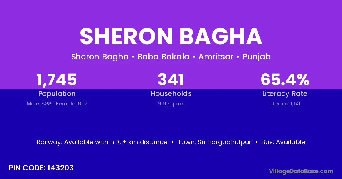 Sheron Bagha village has a total population of 1,745 people, of which 888 are males and 857 are females.