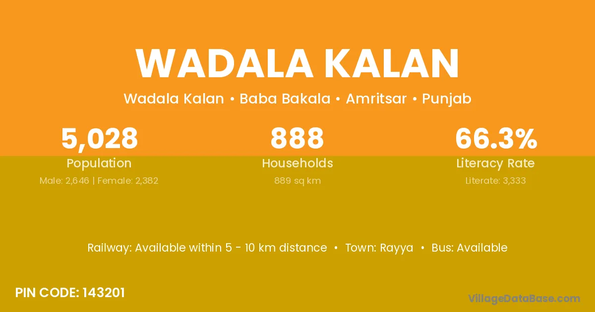 According to Census 2011 information, the village code of Wadala Kalan village is 143201.