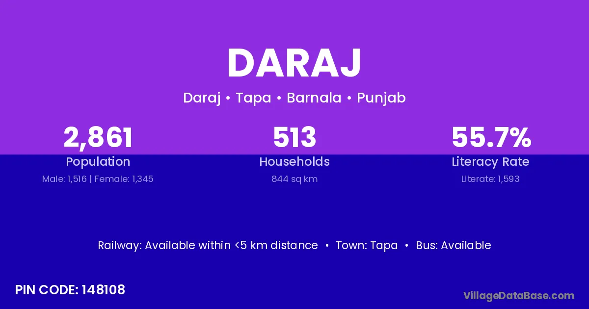 According to Census 2011 information, the village code of Daraj village is 148108.