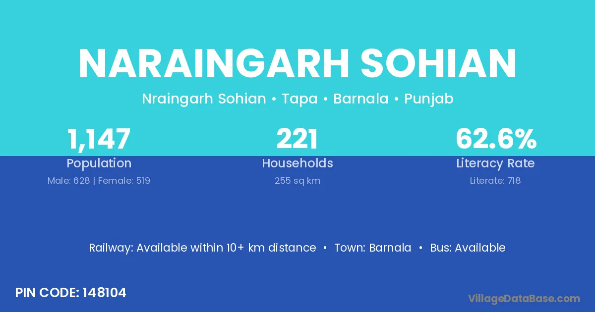Naraingarh Sohian village has a total population of 1,147 people, of which 628 are males and 519 are females.