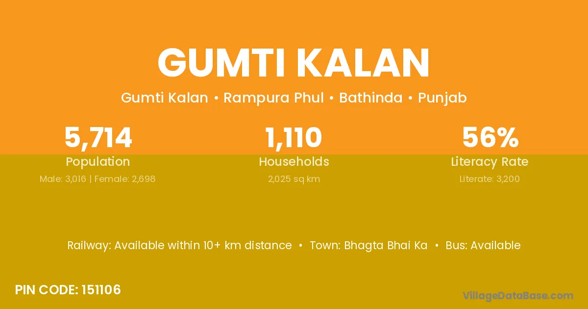 Gumti Kalan village has a total population of 5,714 people, of which 3,016 are males and 2,698 are females.