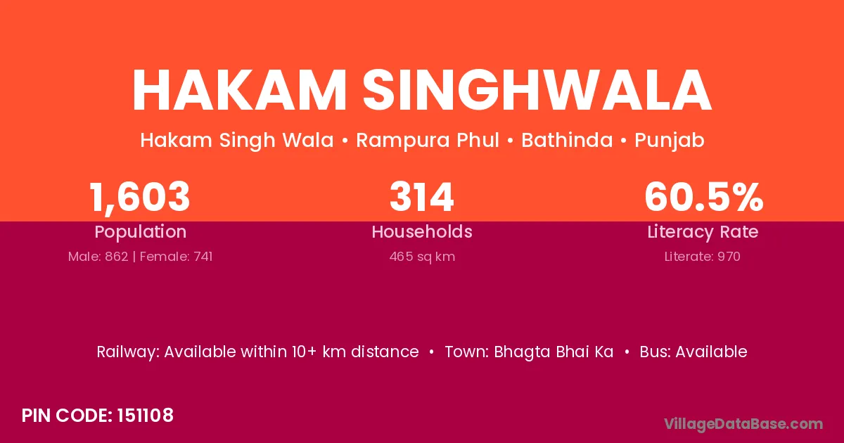 Hakam Singhwala village has a total population of 1,603 people, of which 862 are males and 741 are females.