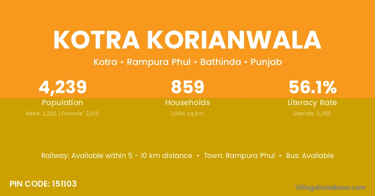 Kotra Korianwala village has a total population of 4,239 people, of which 2,226 are males and 2,013 are females.
