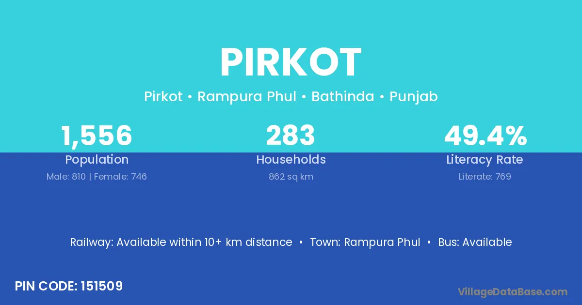 Rampura Phul is the nearest town to Pirkot village for major economic activities
