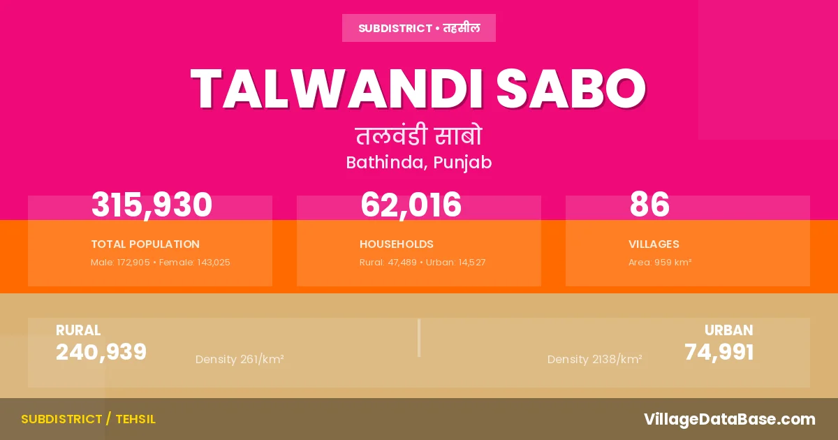 According to the 2011 census The total area of Talwandi Sabo Tehsil is 959 km², with a population of 315930 people. The population density is 329 inhabitants per square kilometre, and there are approximately 62016 houses in the sub district.