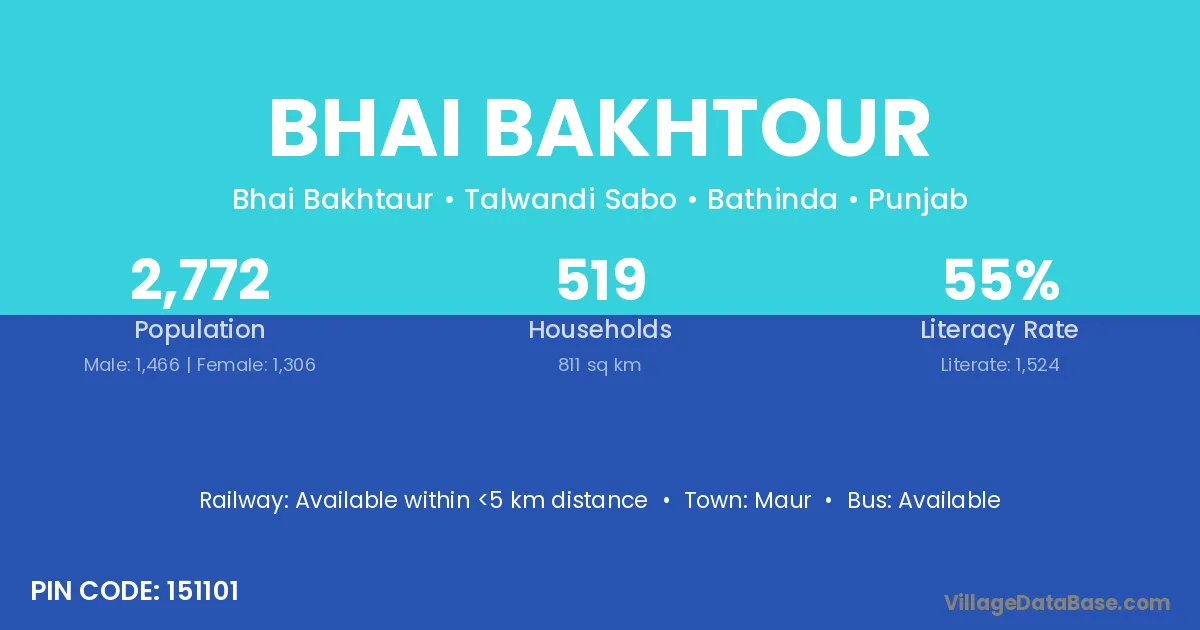 Bhai Bakhtour village has a total population of 2,772 people, of which 1,466 are males and 1,306 are females.