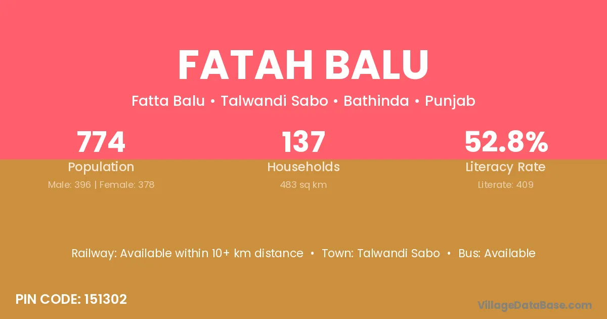 Fatah Balu village has a total population of 774 people, of which 396 are males and 378 are females.